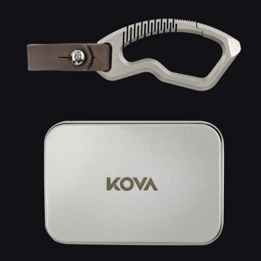 KOVA Blade’s Titan Hook is a compact, multifunctional carabiner crafted from premium titanium—combining minimalist design with rugged utility. Whether you're headed into the wild or navigating daily tasks, the Titan Hook delivers exceptional performance in a sleek, lightweight form. At just 2.5 inches long and weighing 0.6 ounces, it easily attaches to your keys, belt loop, or bag via its built-in carabiner clip. The matte black finish adds a refined, tactical touch, while the integrated bottle opener and sharp cutting edge ensure you're ready for quick, everyday needs. The included leather strap with a snap button and lanyard hole offer flexible and secure carry options.This durable tool is a reliable companion for everyday carry (EDC) enthusiasts and adventurers alike, combining form, function, and refined utility.